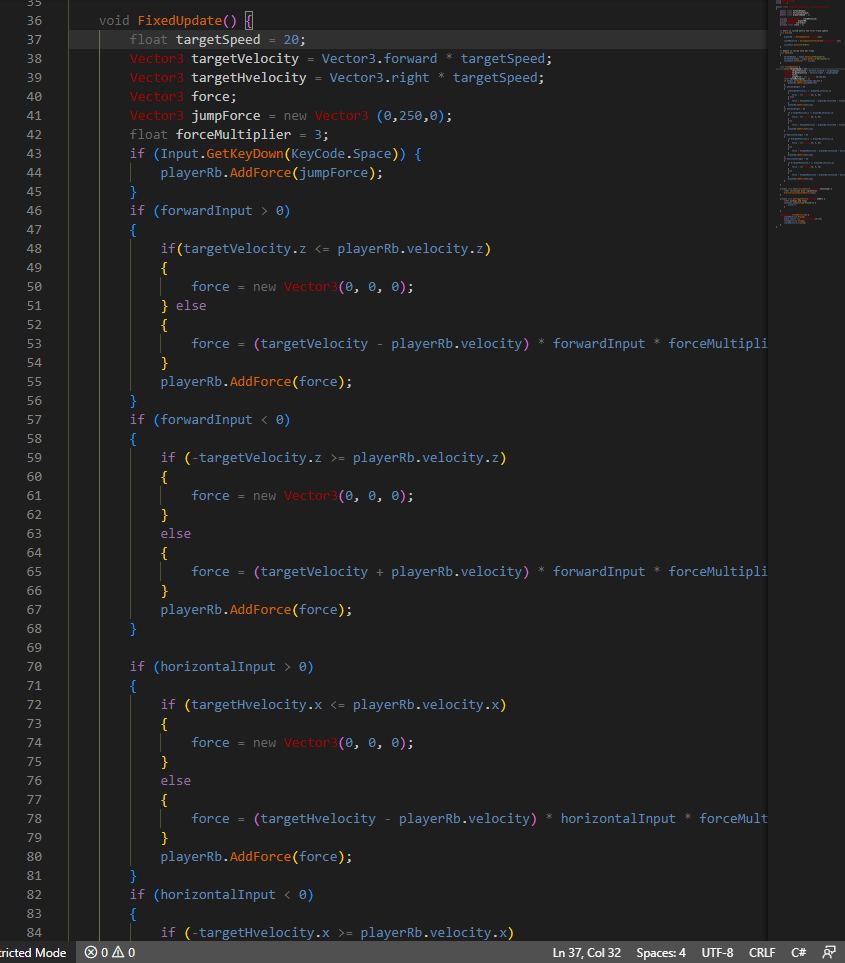 For a project with Cernunnox, a game studio my friends and I created, we wanted to make a movement system for a sphere that integrated into the existing Unity physics system. This movement system had to appeal to a casual market, so simplicity was top priority. We also needed to emphasize impact. The goal of the system was to be able to move your marble around, while being able to impact and dodge other marbles. The system needed to have weight, to make the player feel fast, feel powerful, but also have strategy. Using a force-based system as opposed to a velocity-based system allows seamless integration into Unity’s existing physics, meaning all it takes to calculate dynamic and proportional collisions is a few lines of code. The problem was that is you just say, add a force vector while a button is held down, you quickly gain too much momentum and cannot change direction quickly, inhibiting player reactions. To fix these, I implemented a system that applies a force vector calculated by subtracting a target speed and the player’s current speed.