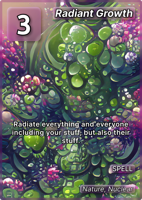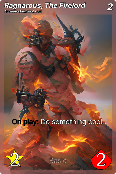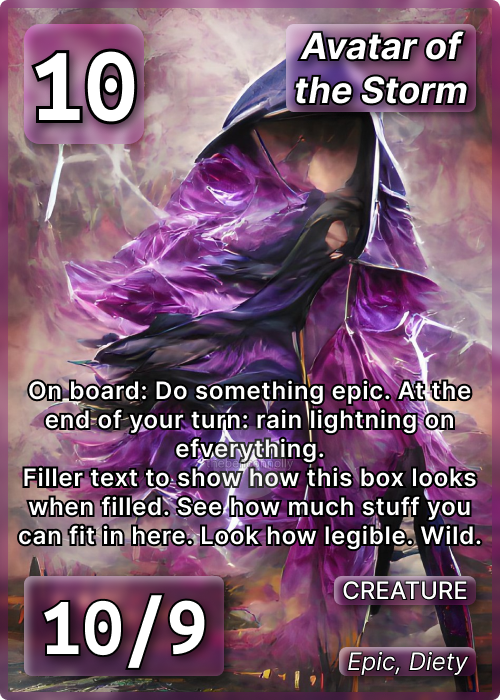 There. Now you can read the card. Well, almost. The text outline is barely noticeable. With no background to distinguish the text from the card art, a large outline is necessary. This is was most apparent when I tried to make a spell card type, so one that has no stats at the bottom, and had very dense art. The need for a bolder text outline is obvious.