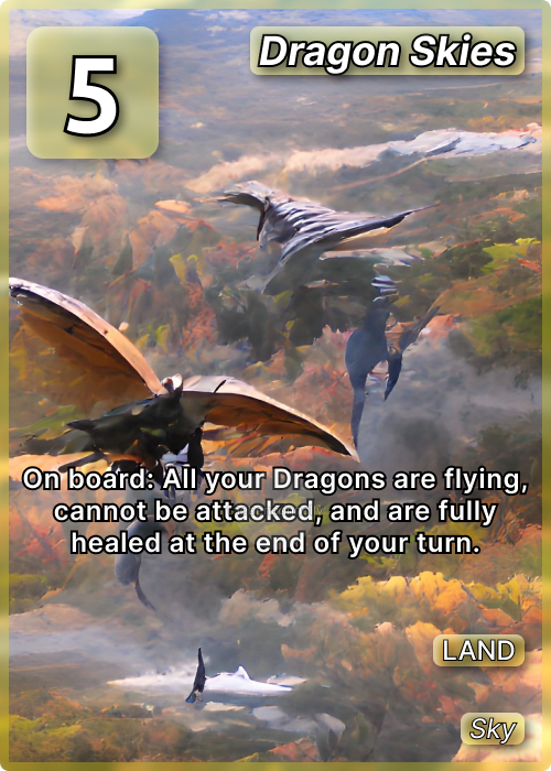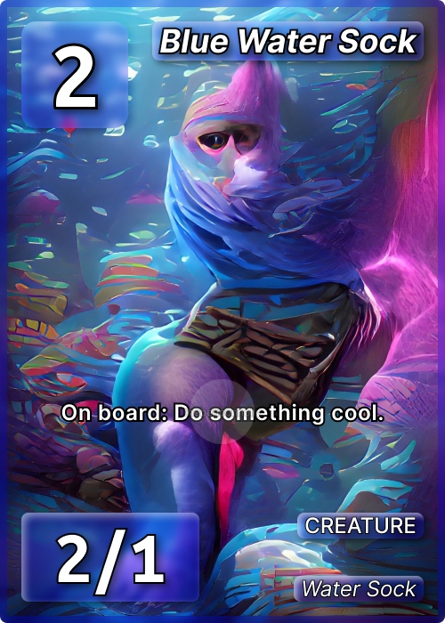 Next I had to address the art issue. With only minimal drawing experience, I’m not at the level where I can just produce my own concept art. So I used Wombo Dream Art, an AI text-to-art generator to create some images. After experimenting with some different keywords, I got a few images that I felt were ready to go. These images are definitely not at the quality of art seen in popular card games, but to be honest, I really like some of these. I think that many could actually be used in a card game, the only problem with this art generator is that the images all look a little too similar to each other. A game with a few hundred cards would be fine, but if you want a thousand plus different cards with different arts, Wombo can’t do enough distinct images for that. But that’s not an issue for a project of this scale.