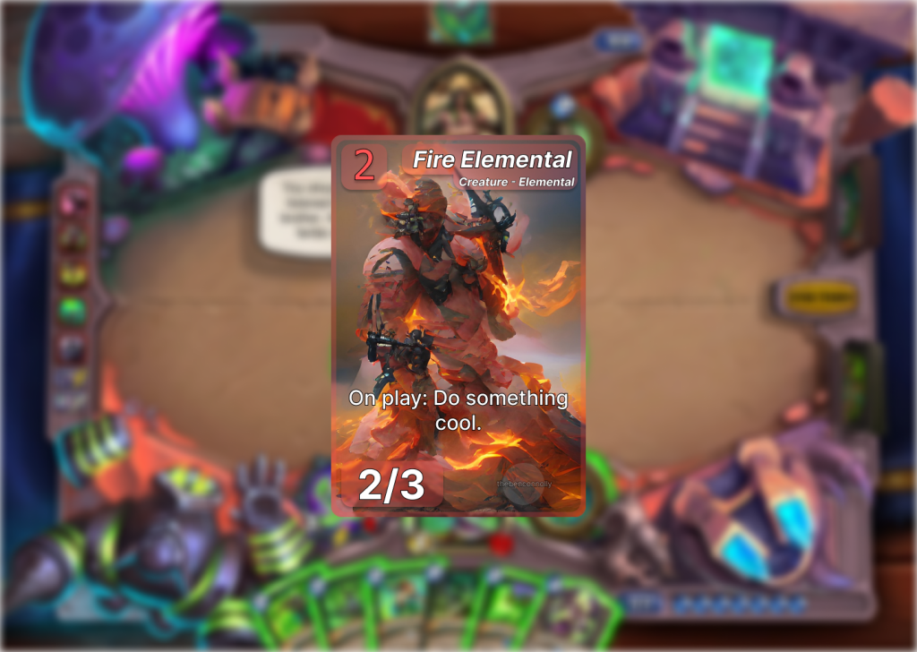 Now, I feel good with my card frame. And even have one for creatures and spells. However, lets play around a bit and see if we can find something better. And one way to do that is by examining the advantages of your medium. Our medium in this case, is digital. So what digital cards can do that physical cards cannot offer is different views. A card can have a different look when hovered over than not. So lets see what would happen if we made a card that used this.