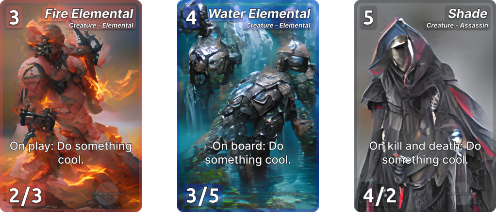 The first step in creating cards for a TCG is deciding how the game will be played. Is it a physical card game, with cards being designing to be printed out? Is it a digital card game? Will it be on mobile or PC? This has so much impact on the card construction. If the games on mobile, then you must respect the smaller screen size. If its a physical card, then you must make sure everything a new player needs is one the card. Flavor text, keyword definitions, every aspect of every ability must be spelled out. But I’m going to be building a digital-first, PC card game for this project.